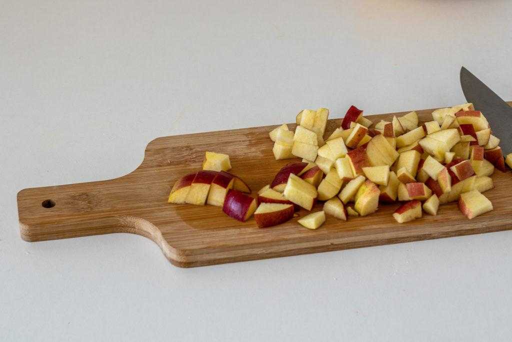 9. Нарежьте мытые яблоки. Кожуру можно не снимать. Она все равно не будет чувствоваться при укусе или застревать между зубами. Обычно это делается просто, чтобы получить более однородную текстуру десерта.