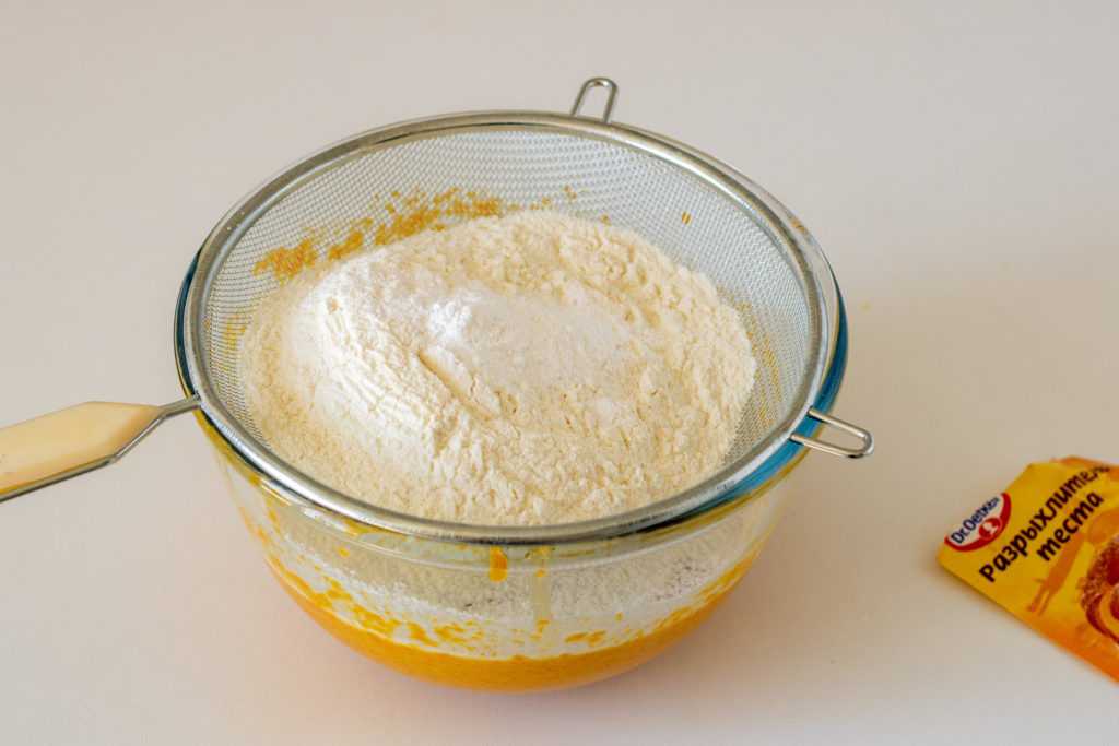 5.Теперь через сито просейте стакан муки. С этого момента тесто мешать нужно только вручную. Удобно использовать силиконовую лопатку, но можно и обычной ложкой. Вмешивайте муку движениями снизу вверх, не интенсивно, чтобы сохранить пышность массы, так как здесь не используется разрыхлитель.
