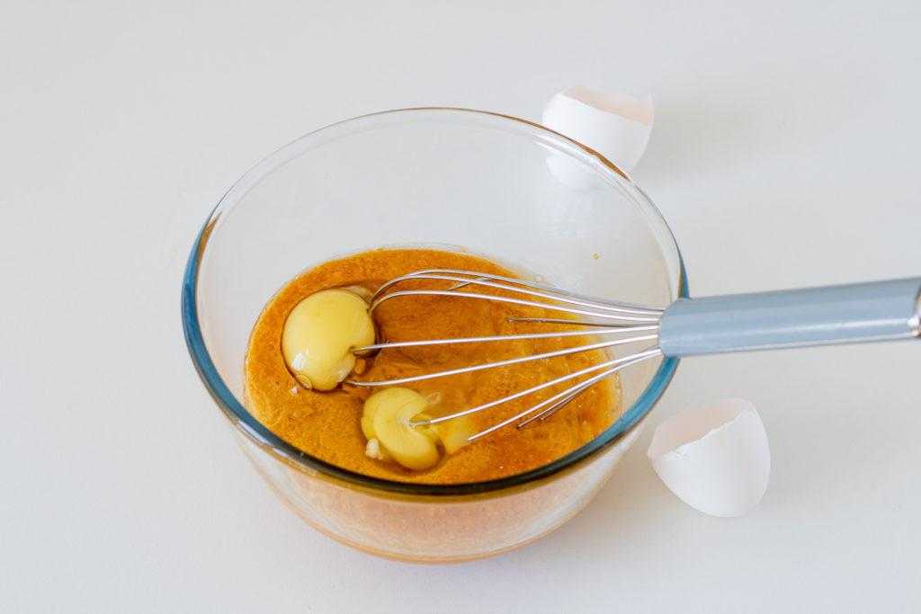 1. В чашке взбейте до однородной массы обычным венчиком куриные яйца. После всыпьте сахарный песок. Перемешайте вновь венчиком.