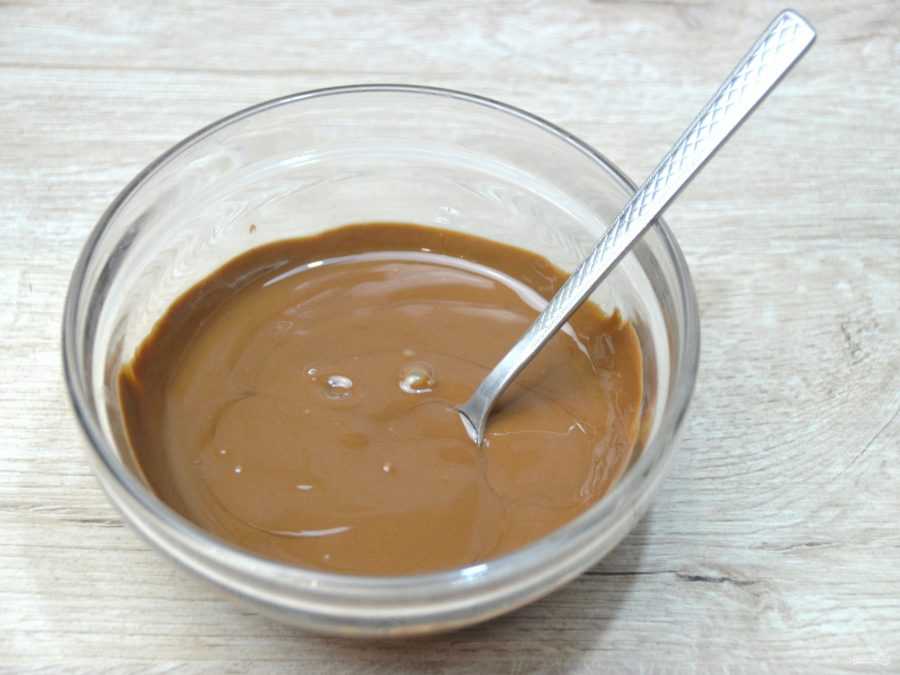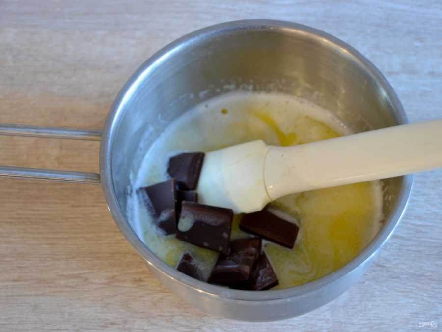 Выложите в растопленную молочно-масляную смесь 100 грамм шоколада, размешайте до однородности.