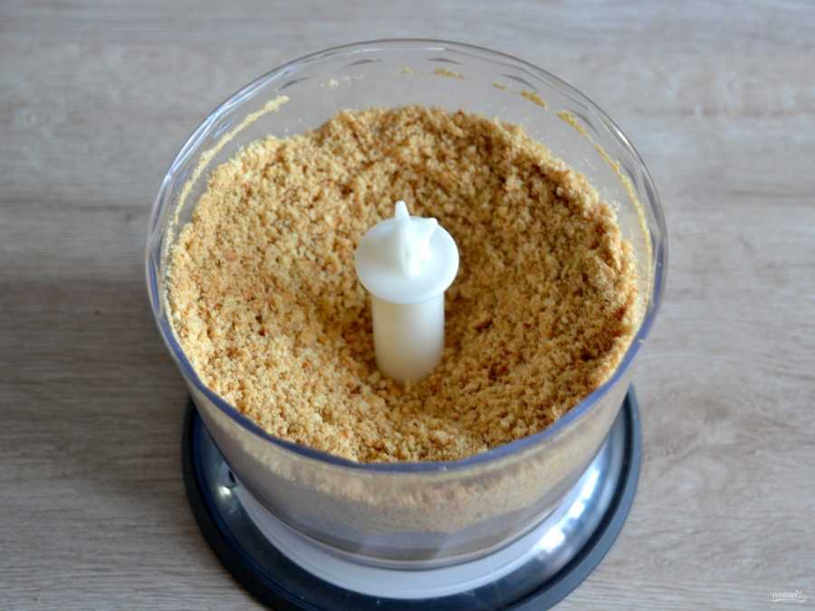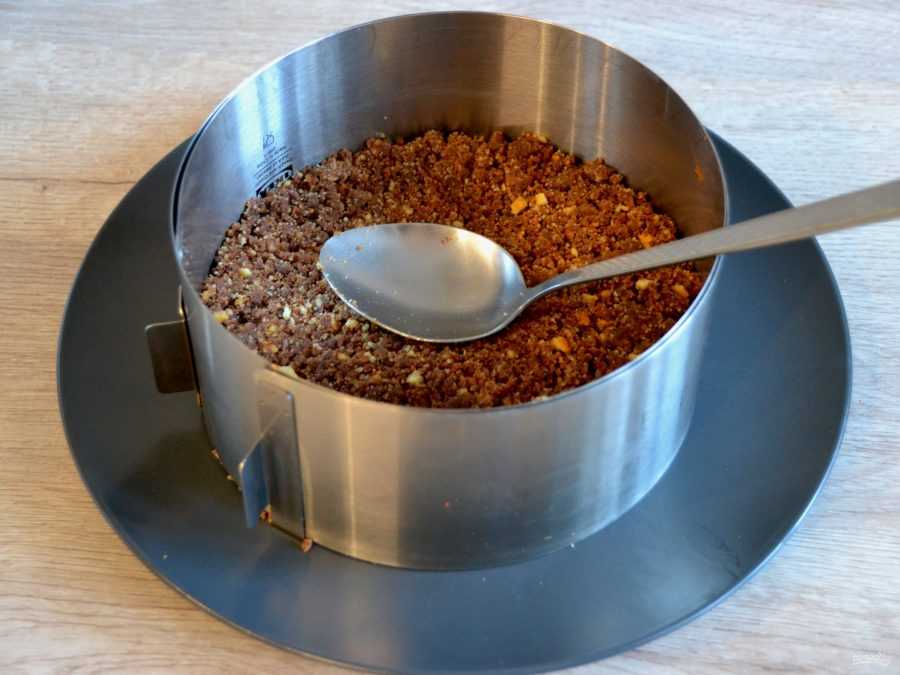 Выложите на крем еще 1/3 песочной шоколадной крошки, уплотните ложкой.
