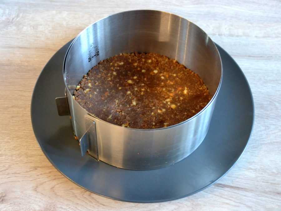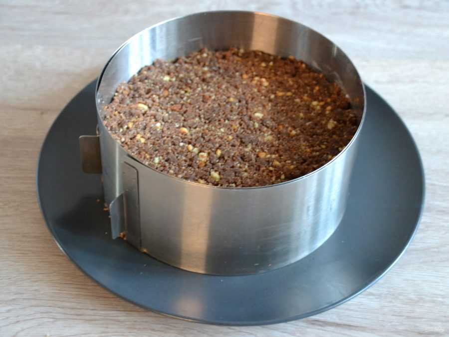 Для сборки торта возьмите кондитерское кольцо, выложите 1/3 шоколадной песочной крошки, уплотните основу торта.