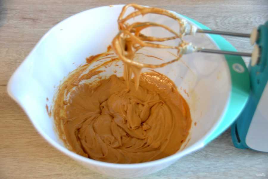 - Для крема смешайте сливочное масло со сгущенкой и взбейте миксером. Жареный арахис покрошите, добавьте в крем и перемешайте.
