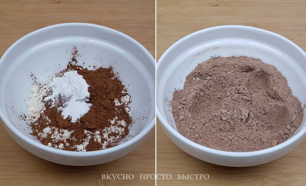 - Смешайте муку, крахмал, какао и разрыхлитель.