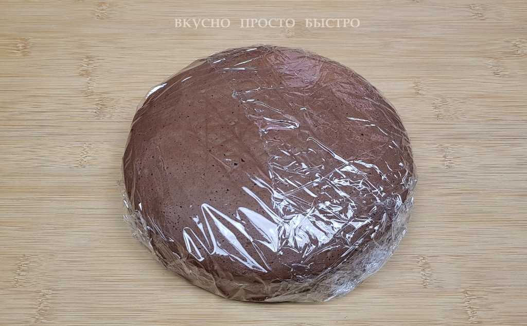 Остывший бисквит заворачиваем в пищевую плёнку и убираем в холодильник отлежаться минимум на 2-3 часа. Если есть время, то можно дать полежать бисквиту в холодильнике сутки.