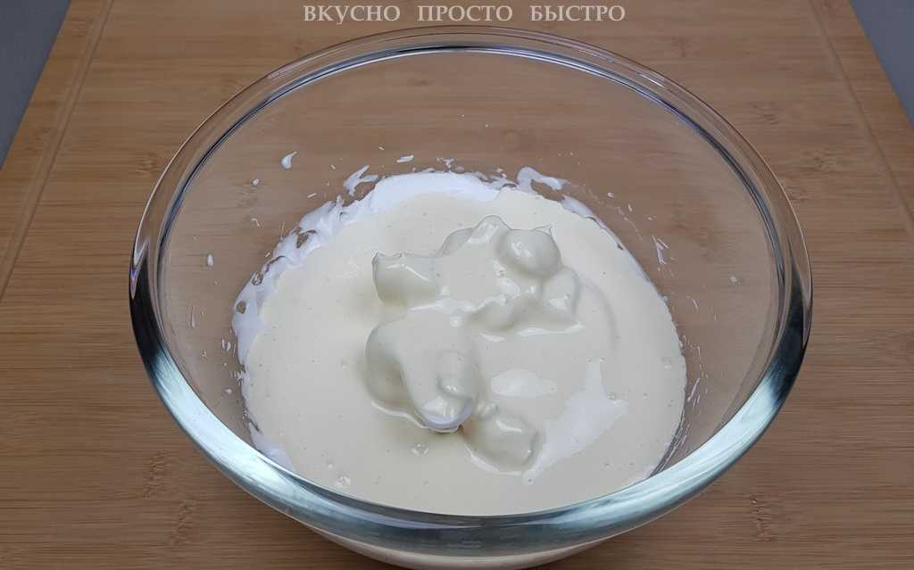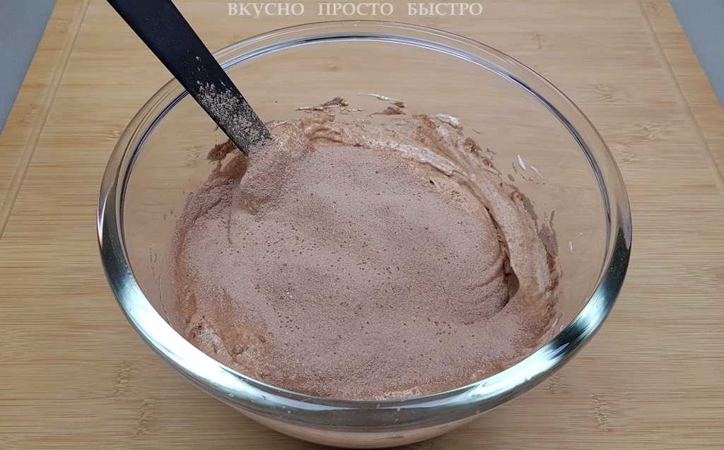 Перемешиваем лопаткой, круговыми движениями снизу вверх. Долго перемешивать не надо, как только масса станет однородной, достаточно. Тесто должно оставаться воздушным.