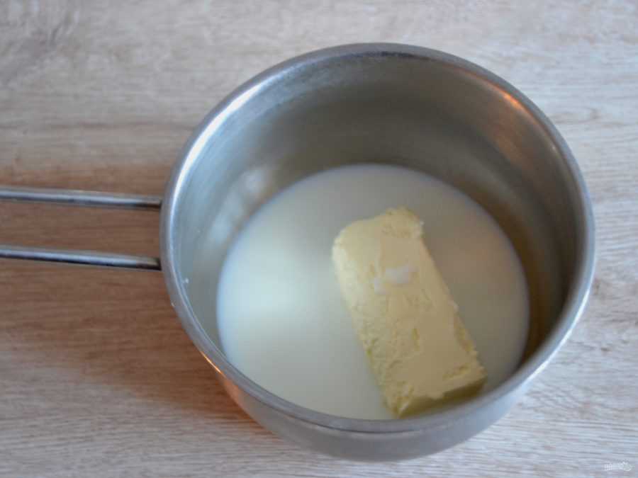 Выложите в сотейник 50 грамм сливочного масла и влейте 50 грамм молока, нагрейте.
