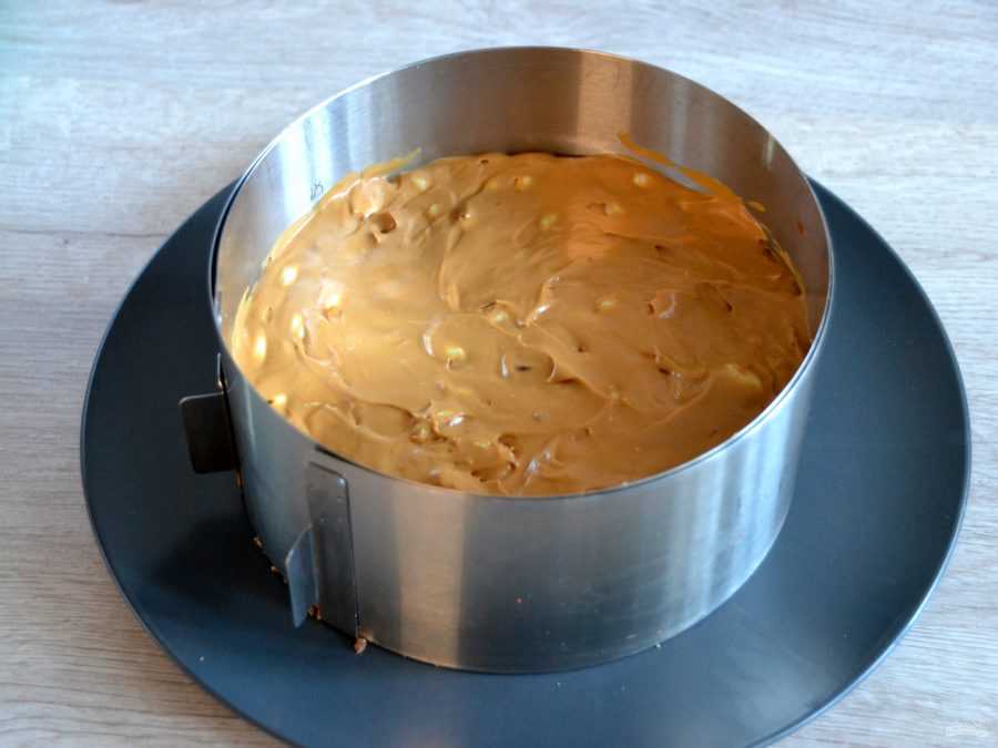 6. На следующий день можно приступать к готовке меренги. Арахис обжарьте на сухой сковороде, а затем порубите на кусочки ножом или блендером. 3 белка взбейте с указанным количеством сахарного песка и добавьте кусочки орехов (количество орехов регулируйте на ваш вкус). Выпекайте в духовке в форме, равной по диаметру размеру торта.