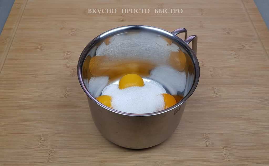 К 4 желткам добавляем 60 граммов или 3 ст. ложки без верха сахара и сразу начинаем взбивать, чтобы желтки не схватились жёлтыми крупинками.