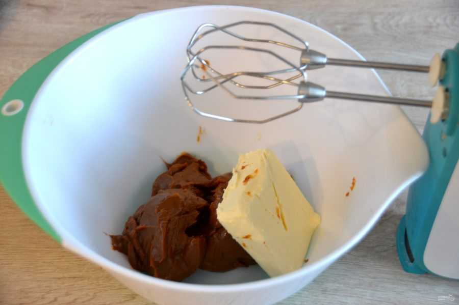 Для приготовления крема взбейте вареное сгущенное молоко и мягкое сливочное масло.