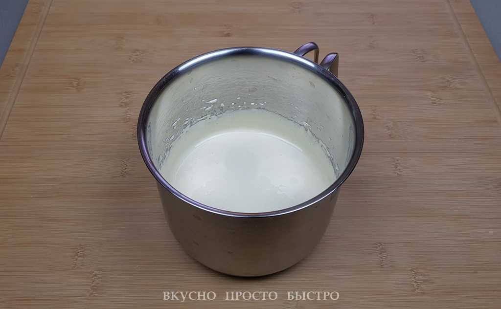 - Подогреть, но не кипятить молоко, влить его в основной состав, перемешать и поставить на небольшой огонь.