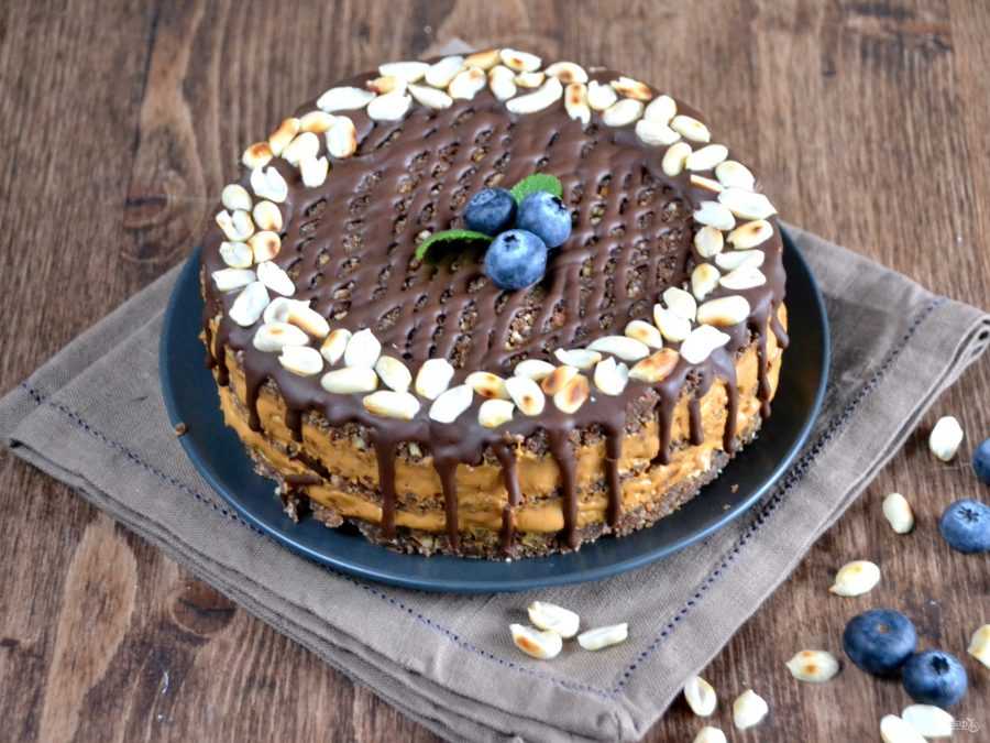 Освободите торт из формы, сделайте на торте шоколадные потеки, сверху нанесите сеточку из шоколада, украсьте обжаренным арахисом, можно добавить свежие ягоды. Дайте шоколадной глазури застыть и подавайте торт к столу.