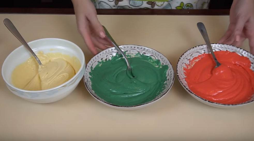 В каждую часть теста добавляем свой краситель, размешиваем и выливаем в подготовленную форму по принципу приготовления торта «Зебра», чередуя ложки с разноцветным тестом.