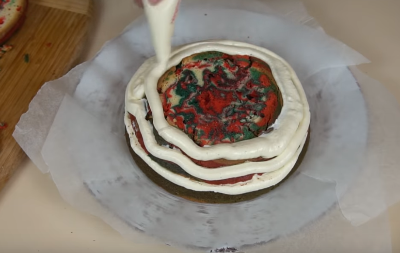 - Нарисовать белым кремом одну полоску по центру и тоже размазать.