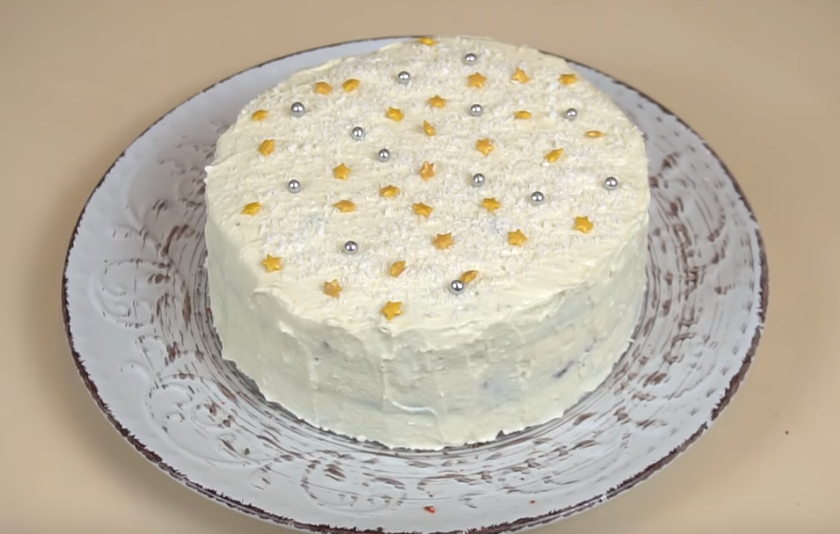 Посыпаем торт кокосовой стружкой и украшаем кондитерскими бусинами и другими элементами кондитерского декора.