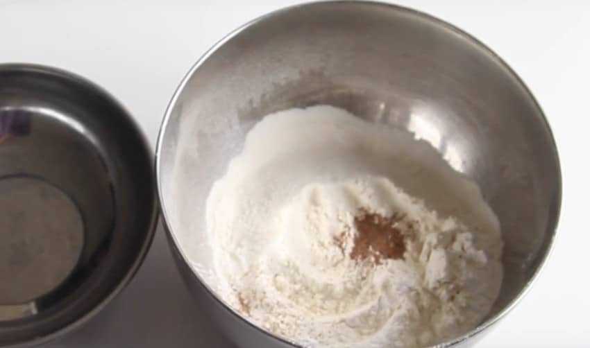 1. В одну миску просейте муку. Добавьте разрыхлитель, соду и корицу.
