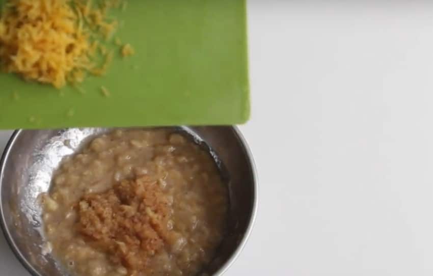 3. На мелкой тёрке снимите цедру с половины лимона. Старайтесь снимать только верхнюю жёлтую часть, тогда выпечка не будет горчить. Переложите цедру к бананово-яблочной массе.