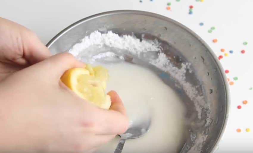7. Приготовьте глазурь. Насыпьте в миску сахарную пудру и небольшими порциями выдавливайте лимонный сок. Перемешивайте и смотрите на консистенцию – она должна быть похожа на сгущенку.