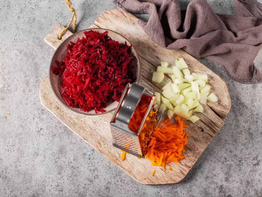 Натираем на крупной тёрке морковь и свёклу, лук режем мелким кубиком.
