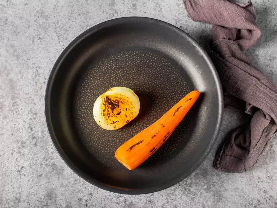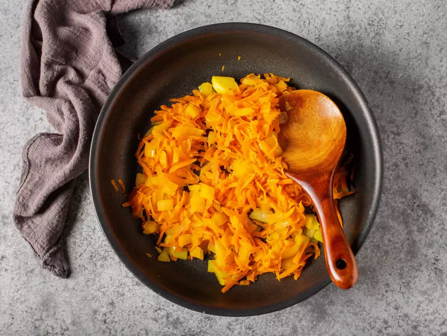 В первую очередь разогреваем сковороду с растительным маслом на сильном огне, выкладываем нашинкованную морковь и снижаем огонь до среднего. Примерно минуту, все время помешивая, пассируем морковку. Но она ни в коем случае не должна поджариться. Морковь имеет свойство впитывать жидкости, поэтому обязательно добавляем 3 столовые ложки бульона, накрываем крышкой и переключаем плиту на средний огонь.
