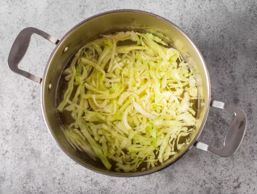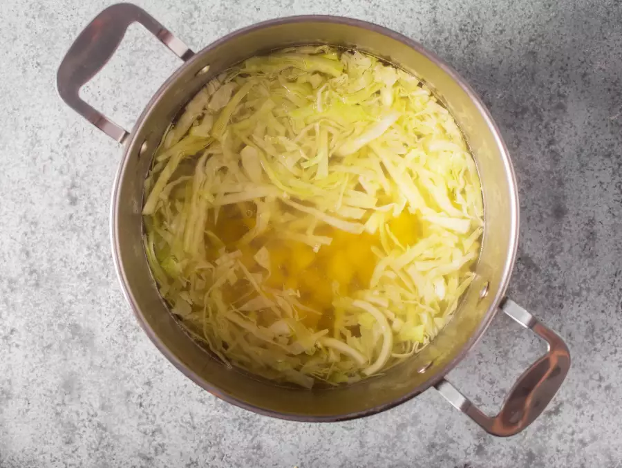 12. Дождаться, когда он снова закипит, и выложить нашинкованную капусту. Варить при небольшом кипении 15 минут.