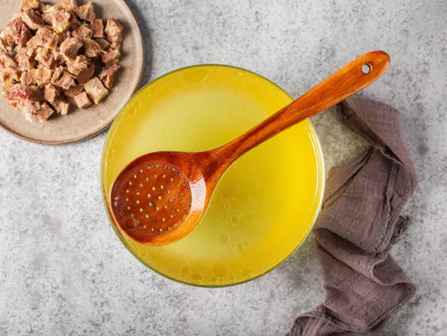 Бульон готов, шумовкой вытаскиваем свинину, бульон можно процедить через сито. Даём косточкам остыть.