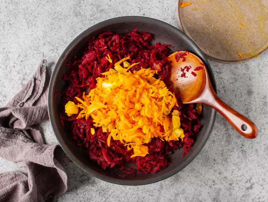 Выкладываем морковь с свёклой к луку, продолжаем обжаривать.