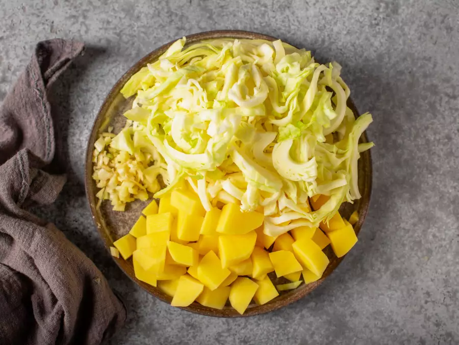 Нарезаем соломкой 200 гр. белокочанной капусты и небольшим кубиком четыре средних картошки.