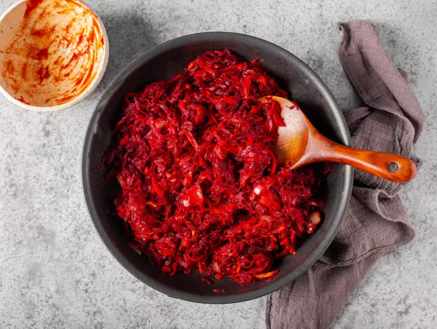 4. Свеклу очистить и натереть на крупной терке либо порезать тонкой соломкой. Посыпать ее сахаром и сбрызнуть уксусом. Это делается для того, чтобы свекла при варке в борще не потеряла свой насыщенный красный цвет, и суп в итоге выглядел особенно красиво и аппетитно.
