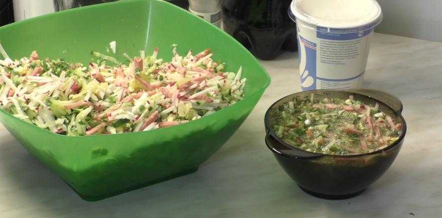 В глубокой салатнице смешать все подготовленные продукты.