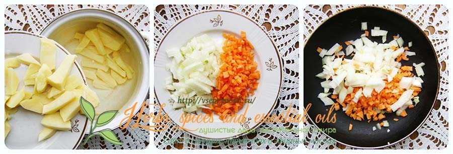 2. Подготовить овощи. Их надо помыть, почистить. Картофель нарезать кубиком, мелко измельчить лук, морковь натереть на крупной тёрке. Лук обжарить на сковороде до золотистого цвета.
