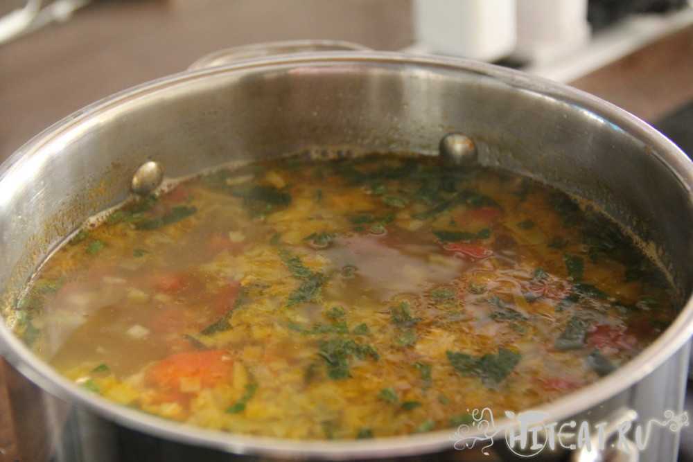 Перекладываем содержимое сковороды в кастрюлю с супом. Чтобы рисинки не слиплись и не остались на дне кастрюли, примерно с полминуты размешиваем суп. Как только появятся признаки кипения, прикрываем суп крышкой и на очень тихом огне доводим его до полной готовности (рис станет мягким).