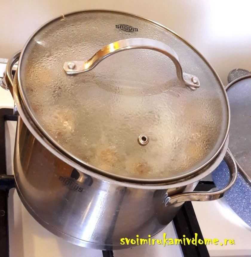 В кипящую воду аккуратно опускаем фрикадельки (на фото они приготовлены заранее и заморожены в морозилке), накрываем крышкой.