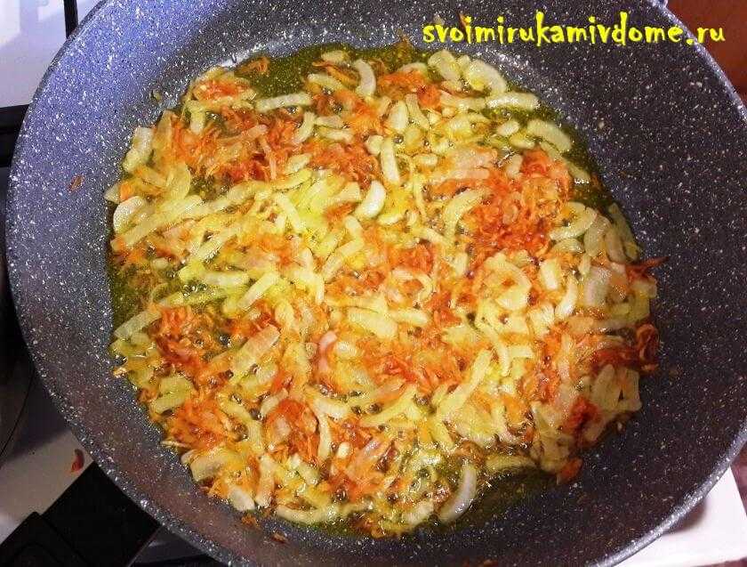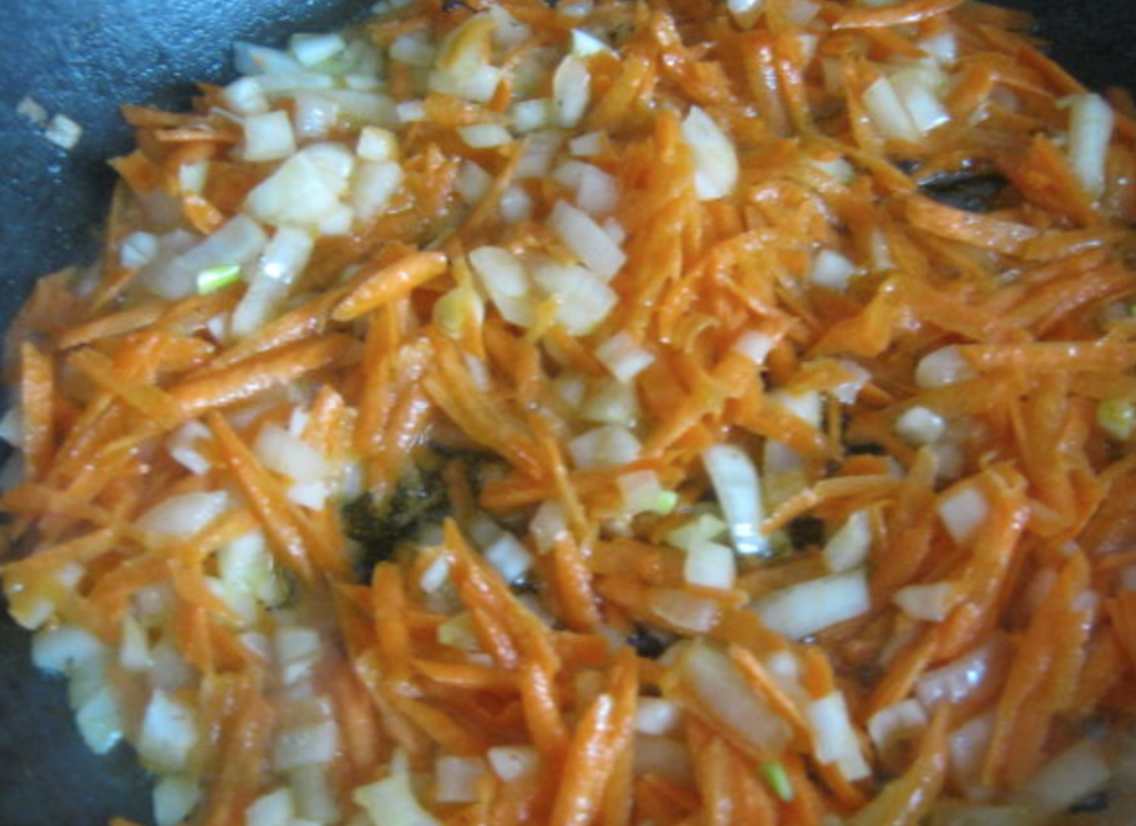 9. Нагрейте сковороду и налейте растительное масло. Обжарьте на среднем огне лук и морковь, помешивая 2-3 минуты