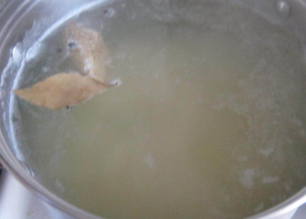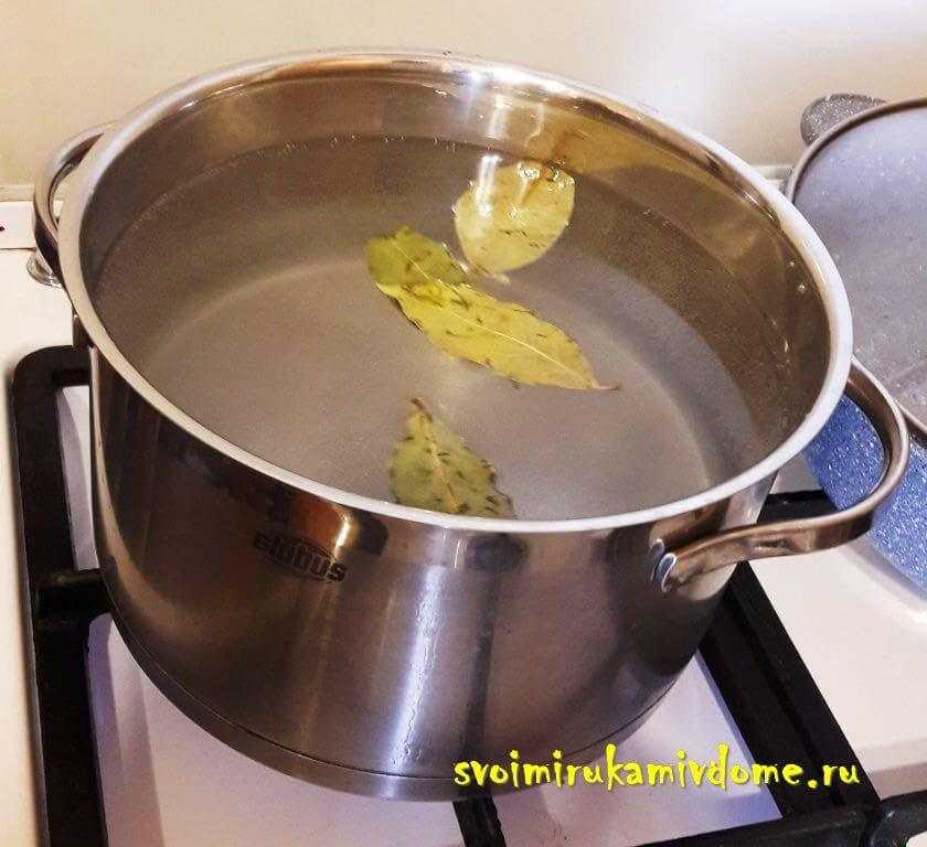 В трёхлитровую кастрюлю наливаем 2,5 литра воды, солим, кладём лавровый лист.