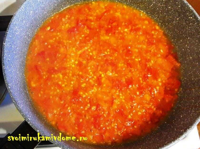 Томаты отправляем в сковороду к моркови и луку или тушим их отдельно минут 5 на большом или среднем огне.