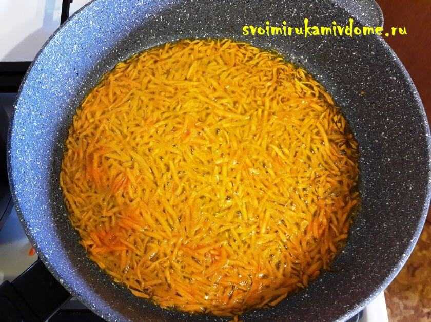 Засыпаем морковь в нагретую сковороду с растительным маслом (можно брать подсолнечное. оливковое или другое, количество масла по желанию), тушим на среднем огне.