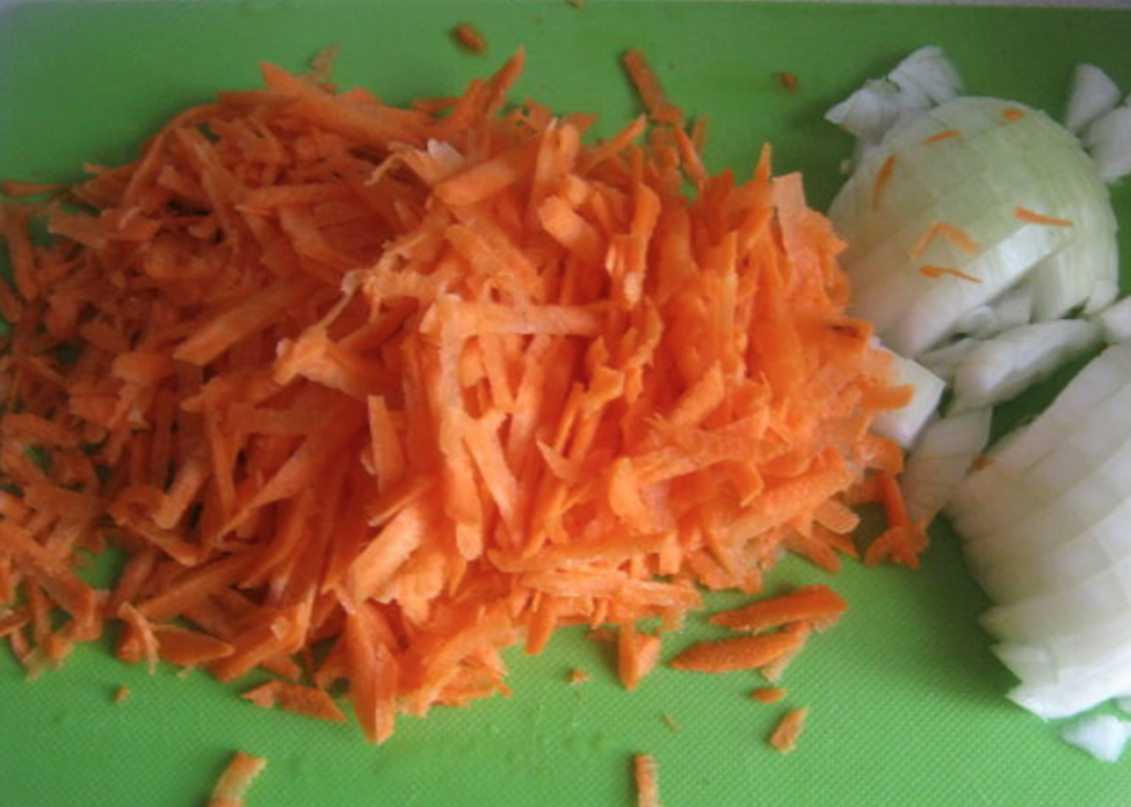 8. Почистите и помойте марковь и лук. Лук мелко нарежьте на кубики, а морковь натрите на крупную терку
