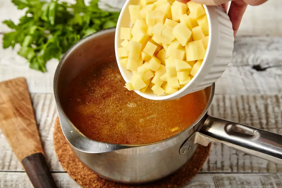 - Очистите 3-4 средние по размеру картофелины, порежьте их кубиками, выложите в бульон и варите до полной готовности примерно 20-25 минут.