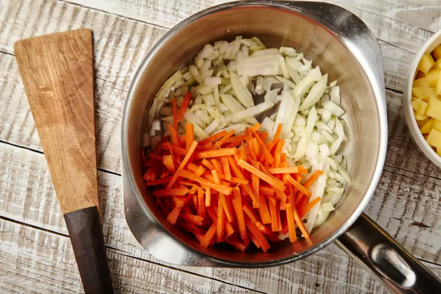 - В сковороде нагрейте сливочное масло и отправьте жариться до осветления нарезанную кубиками морковь и полукольцами репчатый лук. Затем зажарку добавьте в кастрюлю с картофелем.
