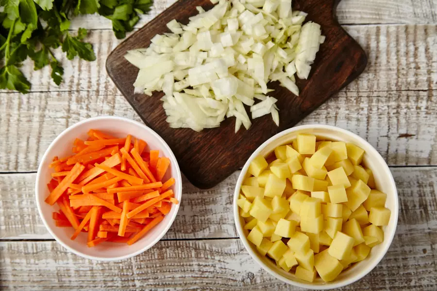 2.Нарежьте картофель кубиком, лук — мелким кубиком. Морковку натрите на крупной терке.