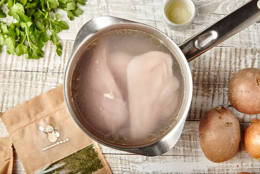 Филе грудки положите в кастрюлю, залейте водой. Закипятите. 1-ый бульон слейте, в нем сконцентрированы все коптящие вещества. А грудку остудите, нарежьте помельче либо чуток крупнее – на выбор. Опять сложите в кастрюлю, залейте незапятанной кипяченой либо фильтрованной водой. Продолжайте варку на слабеньком огне.