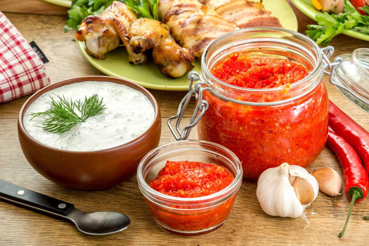 Ко многим блюдам на новогоднем столе подойдет и домашняя аджика, томатный соус, лечо и другая домашняя консервация. Не будет лишним и жирная сметана с лимонным соком, чесноком и маринованными корнишонами.