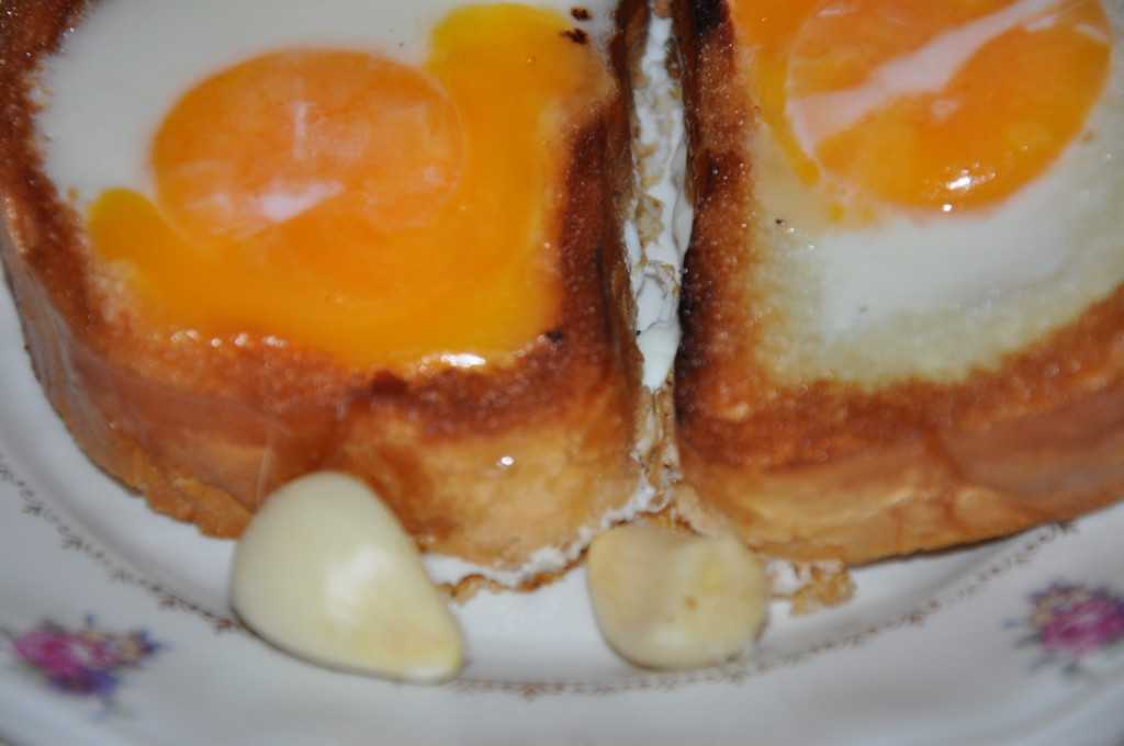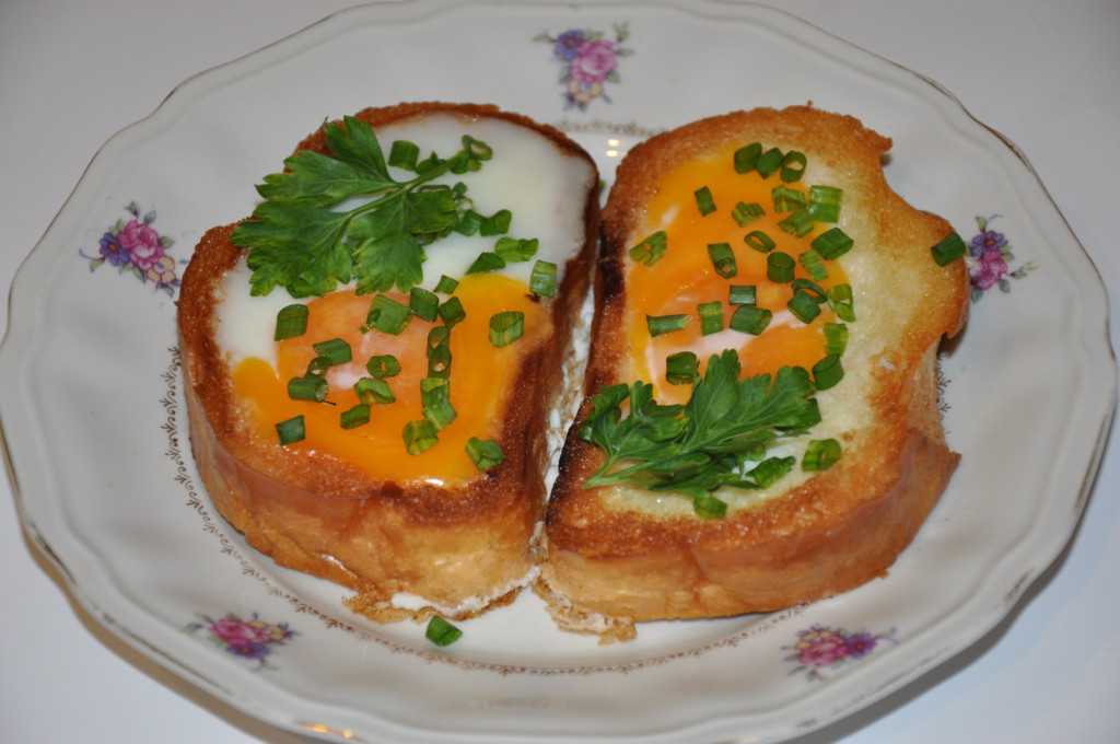 – очень часто сверху на вбитые яйца кладут пару щепоток измельченного сыра, в этом случае хлеб с другого бока не обжаривают.