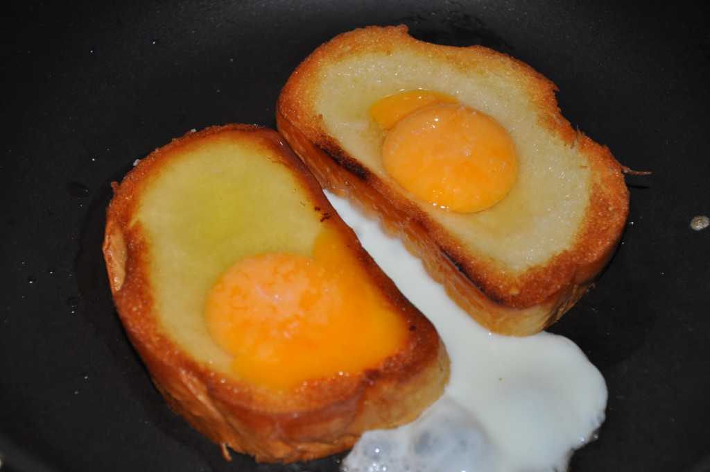 В ломтиках хлеба вырезать ножом или формочкой сердечко, затем обжарить получившуюся «рамку» в сливочном масле до румяной хрустящей поверхности на одной стороне. Далее хлеб нужно перевернуть и вбить в середину яйца, которые затем можно посолить и поперчить по вкусу. Яичницу жарят 3-4 минуты на слабом огне без крышки, затем ее можно перевернуть и довести до готовности еще 2-3 минуты.