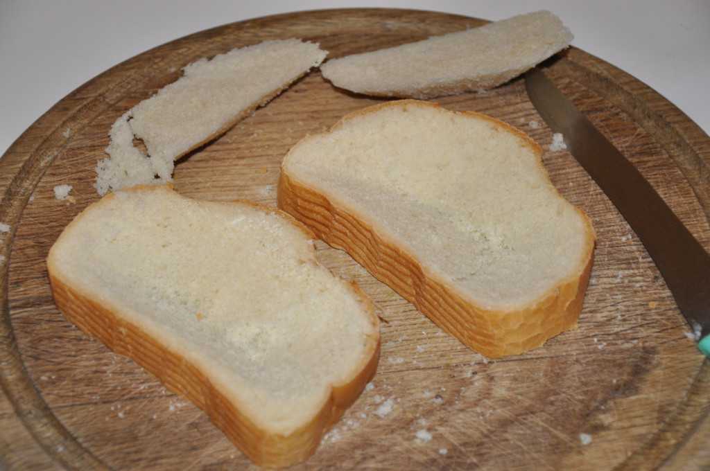 - Вытащите мякиш из кусков хлеба так, чтобы осталась «рамка» толщиной около 1 см.