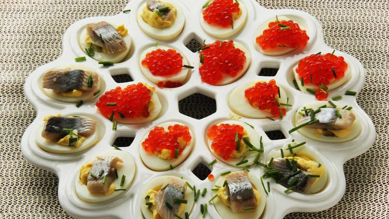 Остается декорировать яйца икринками, зернами кукурузы или граната, веточками зелени, выложить на блюдо и подать к столу.