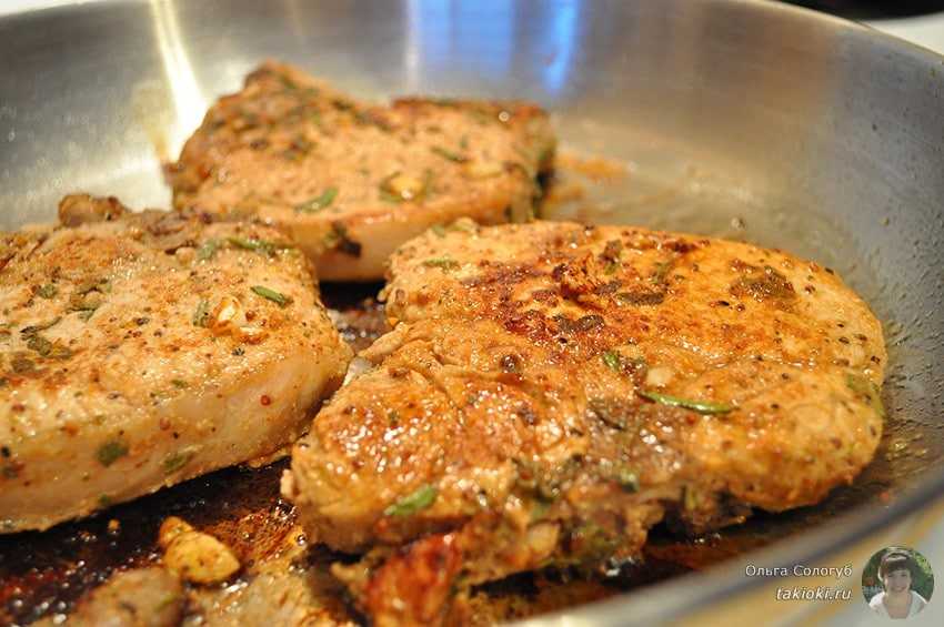 - Когда начнёте обжаривать свинину — огонь не убавляйте, оставляйте его таким же сильным. Жарьте мясо на сковороде, ничем её не накрывая. Не бойтесь, если вы хорошо обсушили антрекоты бумажным полотенцем, то масло не будет брызгать во все стороны.