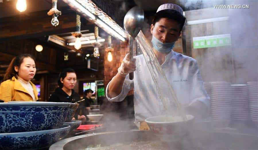 Еще одно известное уличное блюдо китайских мусульман, это лапша ланьчжоу ламень (拉面). Процесс ее приготовления происходит перед глазами клиентов и отличается зрелищностью: повара растягивают тесто на длинные полосы лапши.