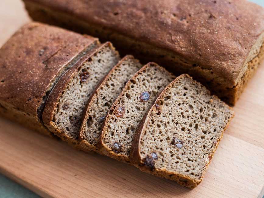 Для этого перемалывается в кофемолке около 100 грамм гречневой крупы. В качестве дополнительного ингредиента используются хорошо измельченные орехи (лучше всего использовать фундук, измельченный при помощи блендера). Этот компонент появляется на стадии первоначального брожения теста и добавляется к нему. Кроме этого в хлеб добавляется изюм, предварительно на 20 минут замоченный в черном чае. После вмешивания всех компонентов в тесто, оно должно отдохнуть и подняться в теплом месте за два часа. Далее хлеб выпекается в духовке при температуре 240 градусов около 40 минут до появления характерного румянца.